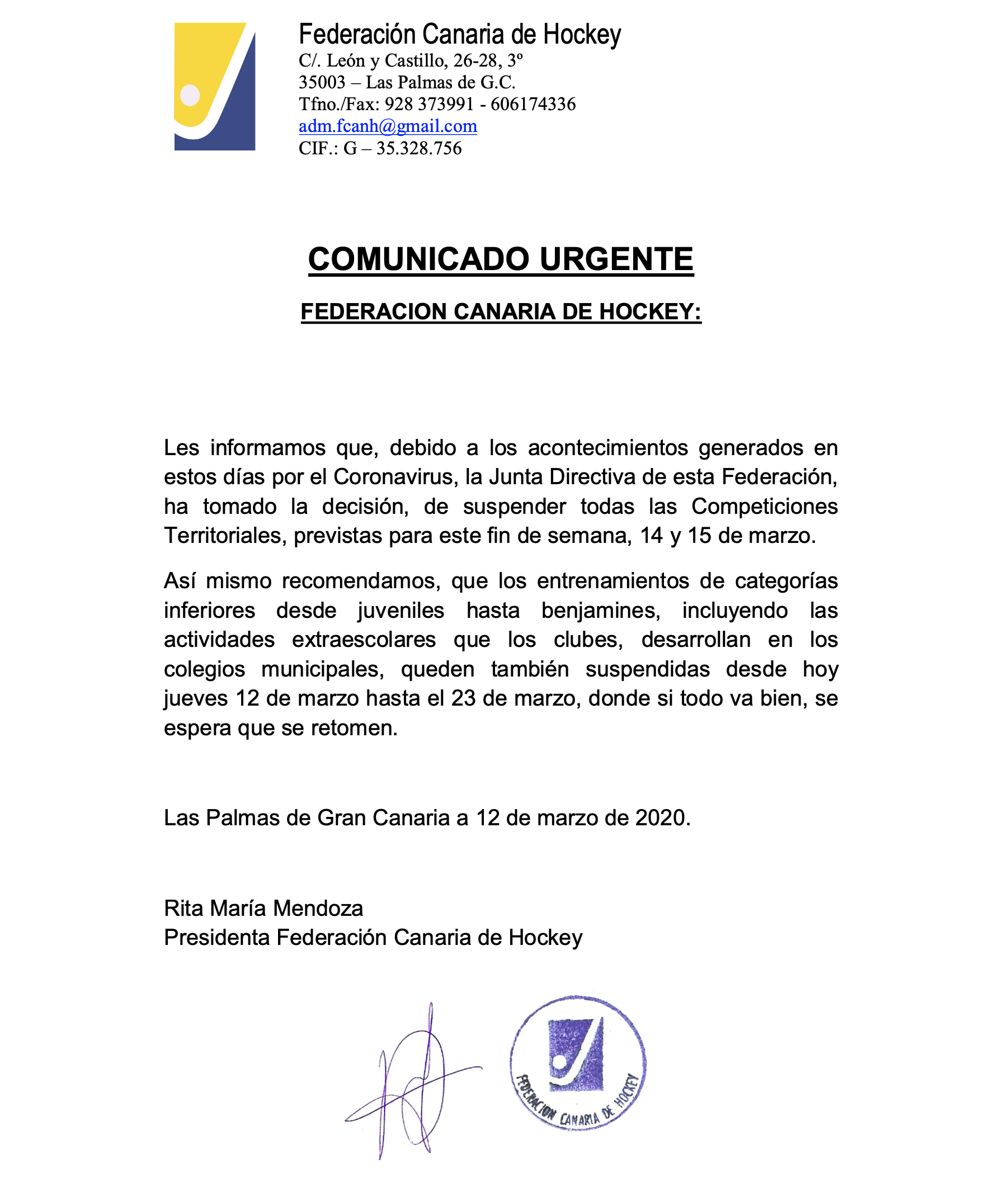 UD Taburiente > Noticias > Actualidad > COMUNICADO URGENTE DE LA FEDERACIÓN CANARIA DE HOCKEY