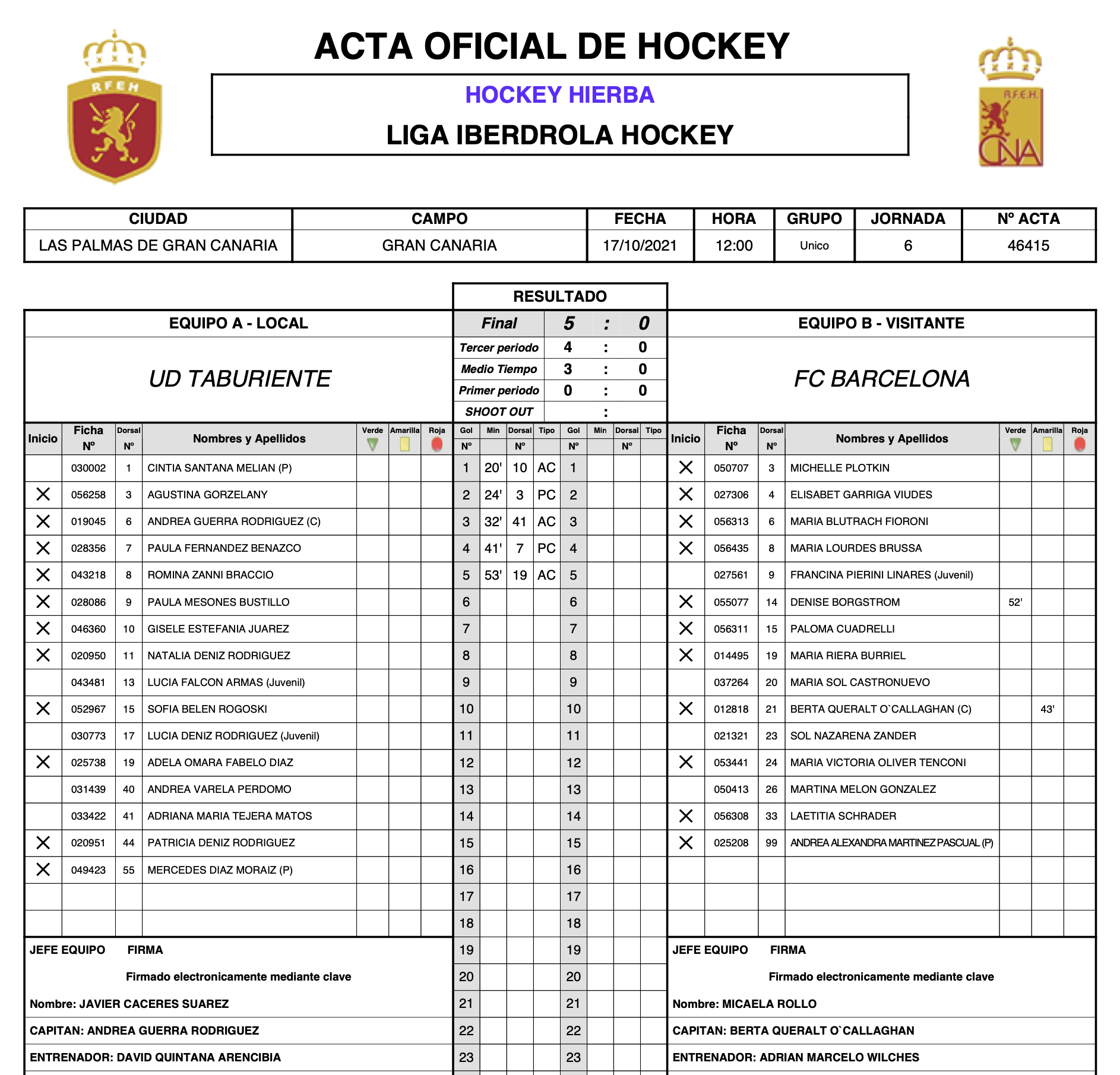El equipo grancanario suma su cuarta victoria consecutiva ante un FC Barcelona que fue dominado de principio a fin por un Taburiente que se coloca al término de la sexta jornada de la Liga Iberdrola en la tercera plaza, a un solo punto del RC Polo, el segundo clasificado (5-0)